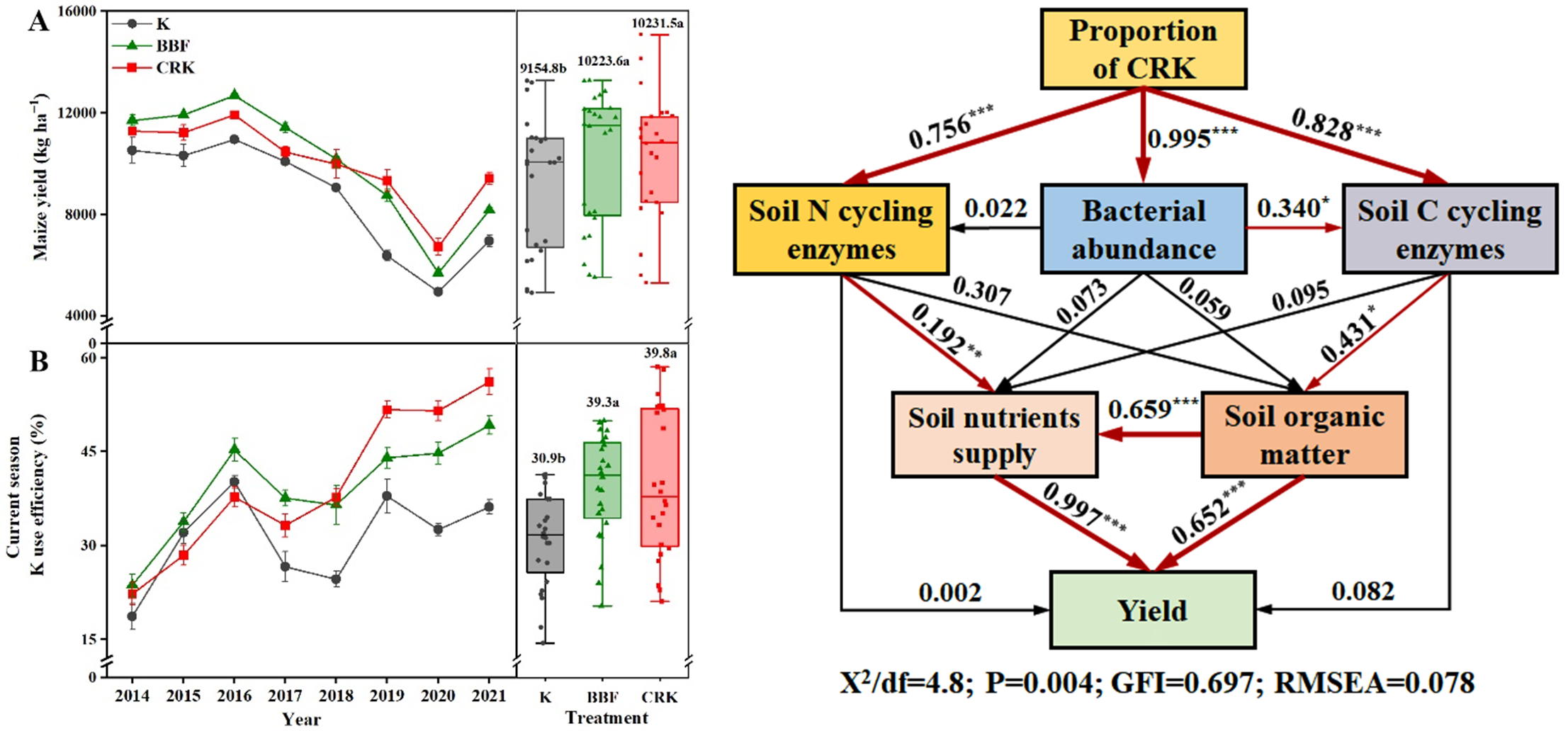 增加施用控释氯化钾的百分比显著提高了与碳和氮循环相关的细菌(Bacillus, Gaiella, and Sphingomonas)的多样性和丰度;钾离子缓慢释放增强了共发生网络分类群之间的相互作用强度,减少功能冗余;显著提高了土壤肥力,增强了土壤菌落的组成和功能,解释了82.8%的细菌菌落变异;直接提高了土壤氮循环酶含量和细菌群落相对丰度,间接提高了土壤养分供应7.1–38.6%,玉米产量提高了11.7–11.8%,钾肥利用率提高了8.4–13.2百分点。