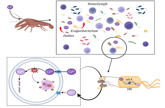 重金属污染不仅影响人类的健康,也制约了现代农业的高效发展。重金属污染严重的区域,动植物的生存受到限制。克氏原螯虾常被用来监测重金属污染,对重金属具有较高的耐受性,但其潜在机制尚不清楚。六价铬刺激诱使克氏原螯虾血淋巴菌群改变,血淋巴中的优势菌群(包括Exiguobacterium)将高毒性的六价铬高效还原成低毒性的三价铬,有效的缓解了重金属对虾的毒害作用。本研究揭示了甲壳动物耐受重金属的分子机制,也可为重金属区域开展养殖提供有力的理论参考。