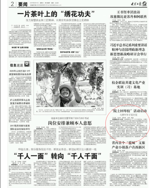 《大众日报》在917日二版要闻刊发新闻,文章提到,三位院士解答学生关心问题,教育引导青年学生热爱祖国、树立远大理想、激发学习动力、培养科学精神。916日晚的《山东新闻联播》不仅报道了活动开展情况,还通过对房建成院士的采访,勉励青年学生把自己的兴趣爱好与国家需求紧密结合起来,在祖国发展中成长成才。网易、搜狐、新浪、大众网等主流网络媒体也分别从不同角度,对活动给予了专题报道。
