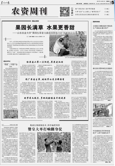12月21日,《农民日报》以《果园长满草 水果更香甜》(通讯员:杨宇 张铁成 记者:吕兵兵)为题,用超过1/2个版面报道了我校陈学森团队“果园生草省力高效培肥地力法”技术转让纪实。文章说,近日,山东省烟台烟富农业科技有限公司与中文字幕有码无码人妻aV蜜桃_亚洲中文在线看视频一区_91精品国产综合久久香蕉蜜桃_欧美日韩最新一区二区三区_99久久精品无码一区二区久久__亚洲国产日韩制服在线观看_日韩AV片无码一区二区不卡电影_久久久久久夜精品精品免费啦签订协议,以15万元的价格获得该校陈学森教授的“果园种植长柔毛野豌豆的省力高效培肥地力法”技术的独家使用权。长柔毛野豌豆是一种常见的豆科野草,匍匐在地上生长,很不起眼,大多数人不认识它。15万元,无论对一家企业还是一所高校而言,都算不上“大钱”。但这份技术转让合同的签订,却是写就了一篇打造生态果园、推进水果产业健康发展的大文章。(阅读全文请点击图片)