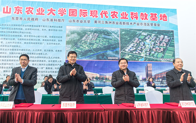 徐剑波:科教基地将充分体现山东农大的办学优势和特色,紧密结合黄河三角洲的地域特点和黄三角农高区的建设需要,重点围绕人才培养、科技创新与成果转化、社会服务、国际交流与合作以及农业文化展示传播等开展建设,力争形成一系列标志性成果,建成一批高水平人才团队,开拓一批新兴学科,建成一批省部级、国家级创新创业平台和国际联合创新平台。同时,基地也将为黄三角农高区加强农业科技创新、示范引领现代农业发展、增强自主创新能力、实现“一二三”产业融合和五化同步发展等,提供强有力的科技支持和人才支撑。对于基地未来的发展前景,参与基地共建的四方意见非常一致,就是要对标国际先进、国内一流,建设绿色环保、节能高效、人文和谐,集生态化、智慧化为一体的科教基地,打造国际先进、国内一流的农业硅谷,成为国内外杰出农业科技人才的集聚地,为我国乃至世界农业的可持续发展道路提供理论创新与实践借鉴。