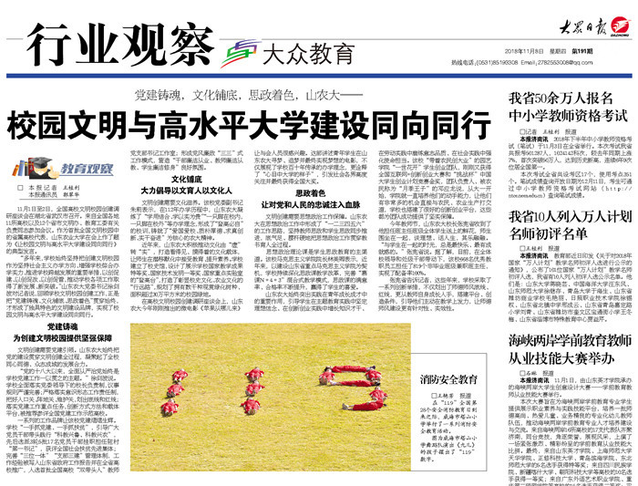 11月8日,《大众日报》刊发以《校园文明与高水平大学同向同行》为题刊发通讯,为我校在文明校园创建中形成的“党建铸魂、文化铺底、思政着色”典型做法点赞。