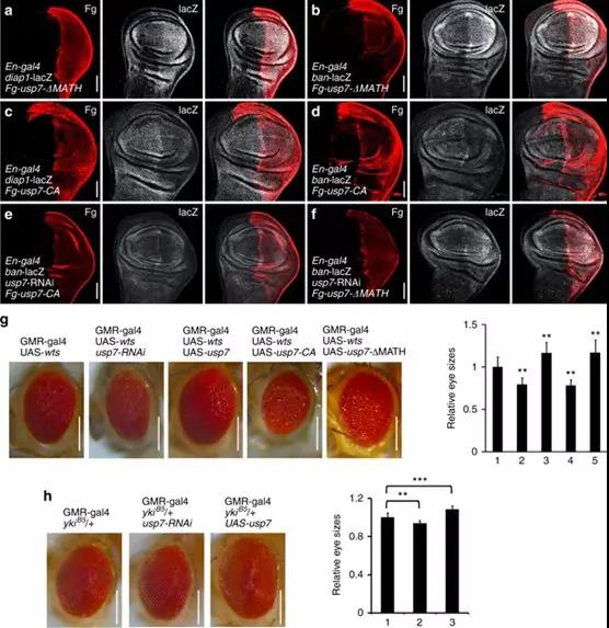 Hippo通路由一组进化中保守的激酶构成,是一条抑制细胞生长、促进细胞死亡的信号通路。在发育过程中,Hippo信号通路控制细胞的分裂和死亡,最终决定细胞的数量,从而实现对器官大小的调控。为了研究Usp7去泛素酶活性对Hippo通路调控的重要性,研究人员构建了一个Usp7去泛素酶缺失突变体Usp7-CA。结果表明,Usp7上的点突变不影响其与Yap的相互作用,但丧失了稳定Yap的能力,表明Usp7去泛素化酶活性对Yap蛋白稳定性调控起着至关重要的作用。进一步研究表明,Usp7通过去泛素化Yap抑制Yap的降解,最终调节Hippo通路的活性。Usp7的缺失,会导致果蝇眼睛和翅膀体积变小。